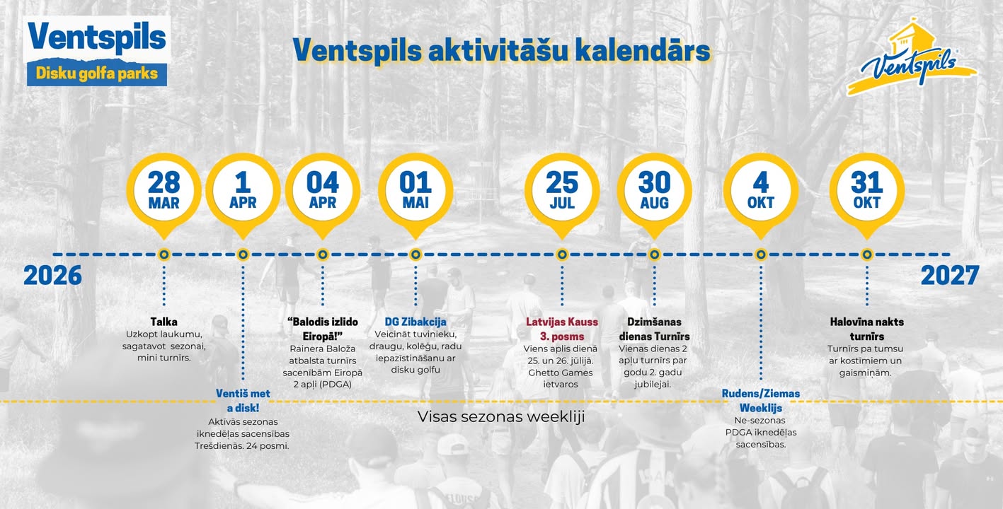 Ventspils Disku Golfa Parks 18. Marts, 2026 Vai esi gatavs sezonai? Jau drīzumā griezīsim pulksteni un iegriezīsim disku golfa aktīvo sezonu! Pirmais pasākums jau 28.martā Ventspils Laukuma Talka! https://www.facebook.com/442417862283049_122195849156535051